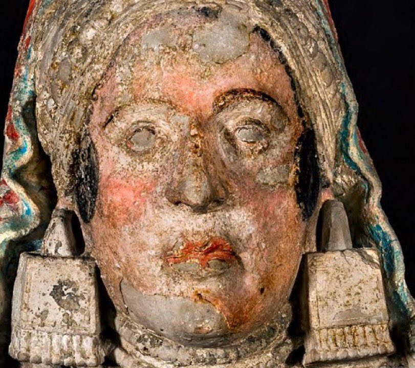 3. La magnífica pieza que mide aprox. de 47 cm. y pesa 20 kg. está realizada en piedra caliza, cubierta de estuco pintado. Cuando te fijas en ella su media sonrisa te atrapa, a mi me recuerda un poco (opinión personal) al rictus de la Mona Lisa. Sus labios de un rojo intenso ⤵️