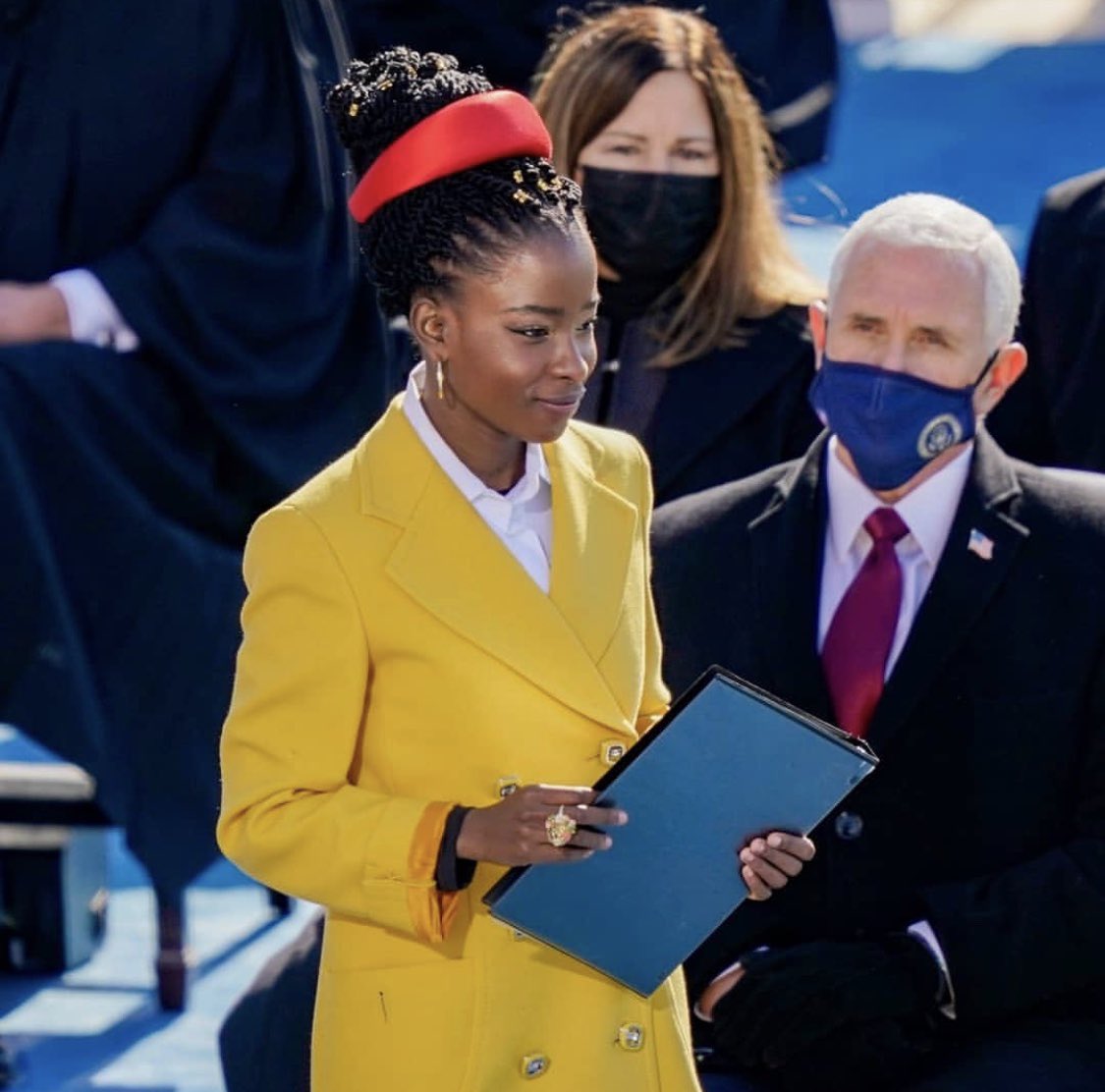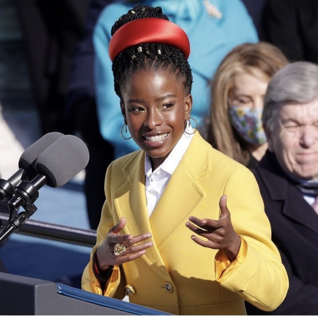 أماندا خريجة جامعة هارفارد وألقت أول قصائدها في عمر ال ٦ وقالت انها ممكن تترشح للرئاسة مستقبلاً في عام 2036،لكن لفتني اختيارها للون الأصفر و الطوق الأحمر، اختيارها كان ذكي و أختارت أكثر لونين مُلفتة و تبرزها أكثر بالذات أمام جمهور كبير ووسط أشخاص أغلبهم لابسين ألوان داكنة وحيادية