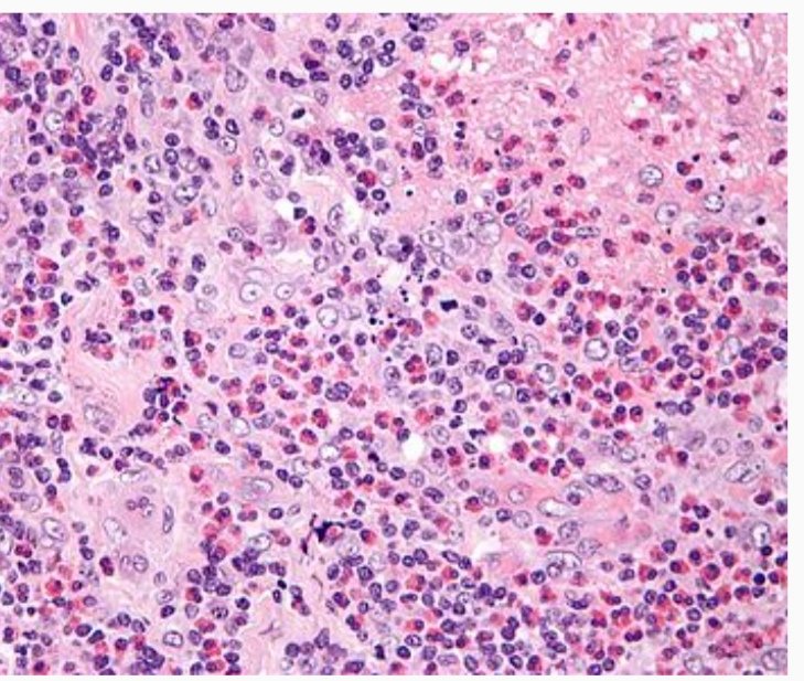 Efectivamente! Se ven sobre todo eosinófilos. En otros cortes se vieron abscesos eosinofílicos y abundantes centros germinales.
