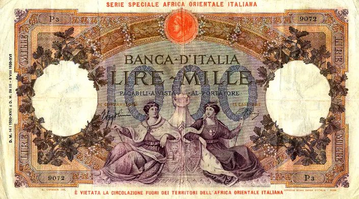 1939 yılında Doğu Afrika sömürgesinde kullanılan İtalyan Lireti’nin üzerinde İtalyanca Doğu Afrika Sömürge bölgesi yazmaktadır. +