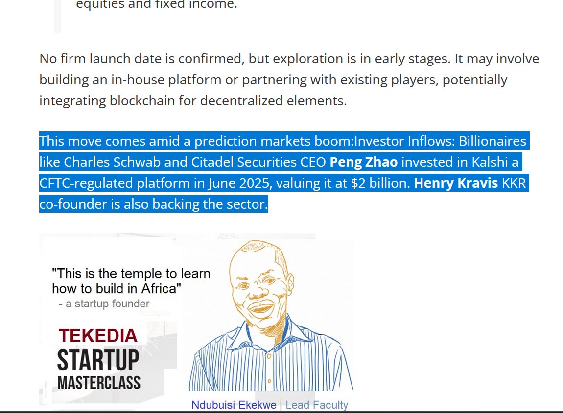 "Bloomberg reported on October 6, 2025, that Citadel is considering launching or investing in a prediction & betting platform. This aligns with broader Wall Street interest in the space, where markets have seen explosive growth post-2024 US elections." tekedia.com/citadel-explor…