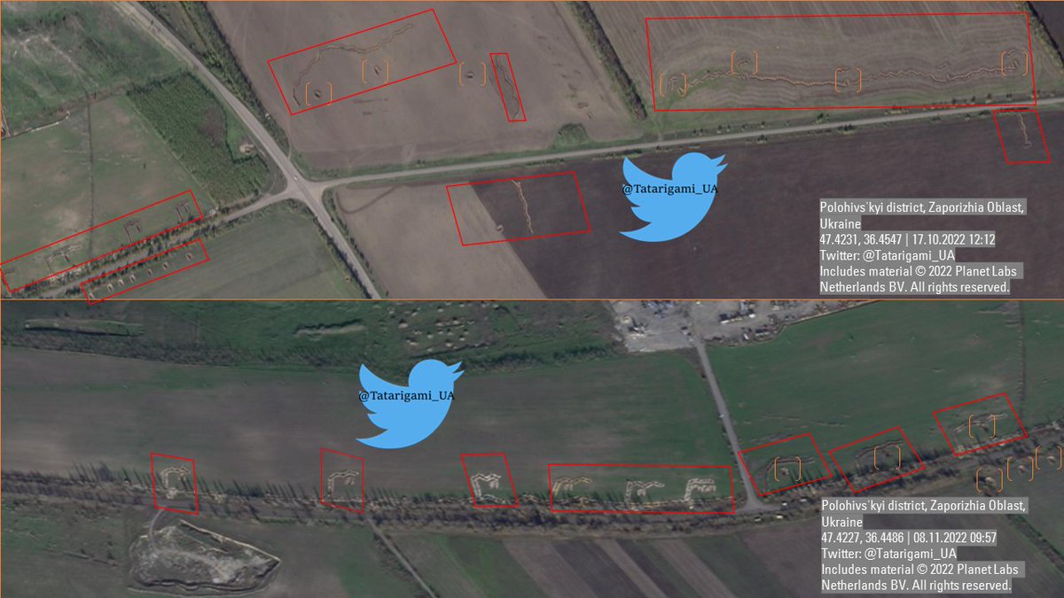 Since Mid-October, Russians have been anticipating the Ukrainian offensive operation, and have been constructing defense lines all way from Enerhodar to Polohy and even further. These particular trenches appeared between April and May.