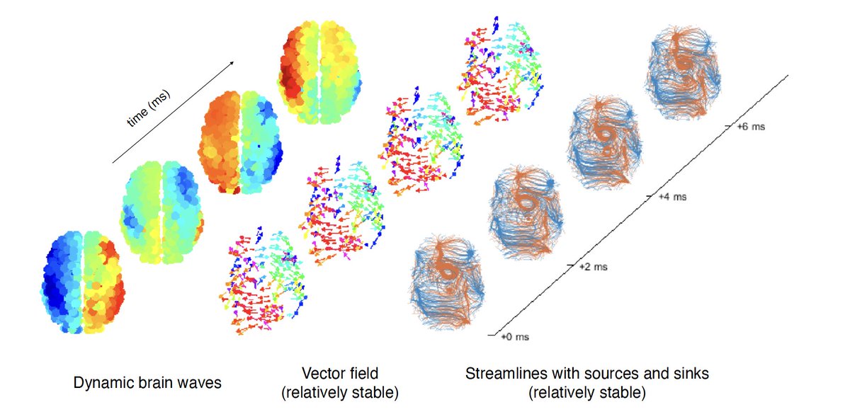 To visualise these dynamics, use the Hilbert transform to extract local phase vectors from each node, then techniques from optic flows to find the underlying dynamic streamlines