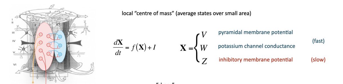 For a whole brain model, one needs to reduce the high dimensional behaviour of local neural populations to a few variables, typically mean firing rates of excitatory and inhibitory neurons