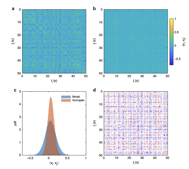 Recurrence plots (top left, which detect recurring patterns in spatiotemporal data) benchmarked against phase randomized surrogate data (top right) reveal a relatively small repertoire of such metastable states