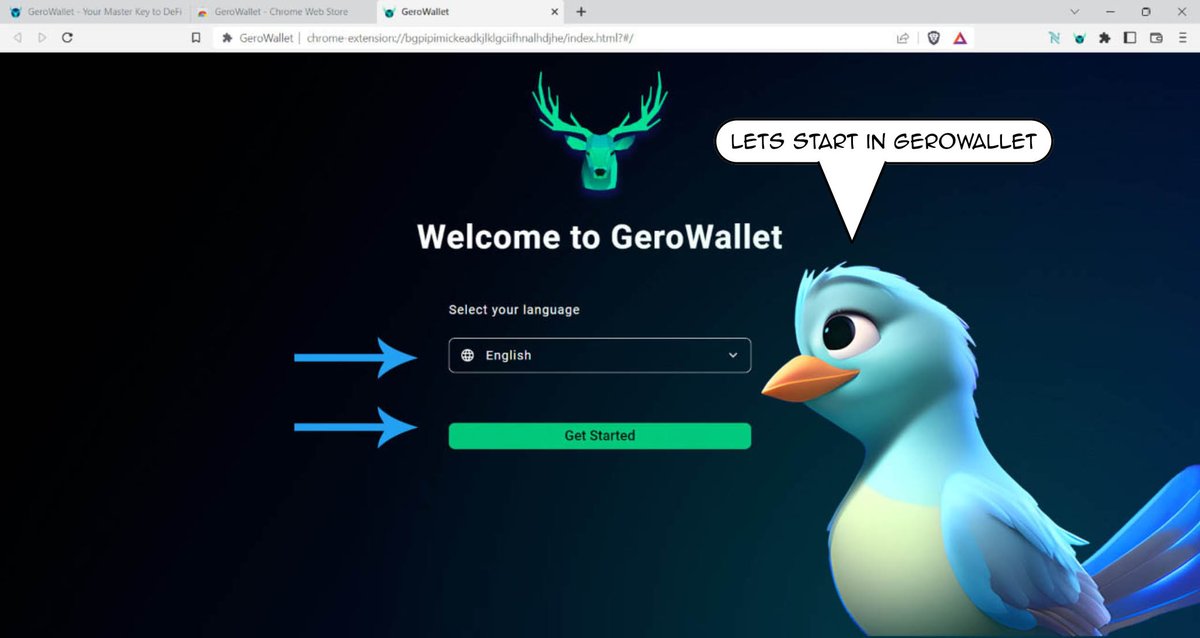 Now you are in the welcome page of @GeroWallet . Select your prefered language and click on the button 'Get Started'.