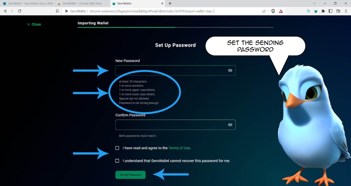 Proceed to set a new password and confirm it. It must be 10 characters long, have at least 1 lower case letter, 1 upper case letter and spaces are not allowed. Check the boxes that you agree of its Terms of Use and that @GeroWallet cannot recover the password for you. (7/13)
