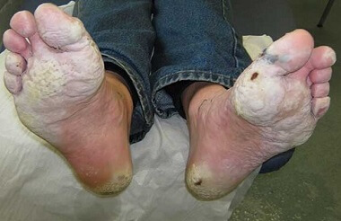 10/ Na początek nie wygląda to najgorzej. Natomiast to dopiero początek. Stopa drętwieje, zmienia kolor, puchnie i zaczyna cuchnąć z powodu uszkodzenia skóry, naczyń krwionośnych i nerwów w stopach. Zmienia się w coś takiego.