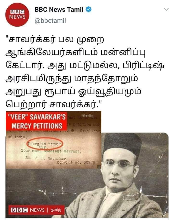 "சாவர்க்கர் பல முறை ஆங்கிலேயர்களிடம் மன்னிப்பு கேட்டார். அது மட்டுமல்ல, பிரிட்டிஷ் அரசிடமிருந்து மாதந்தோறும் அறுபது ரூபாய் ஓய்வூதியமும் பெற்றார் சாவர்க்கர்." - BBC News.