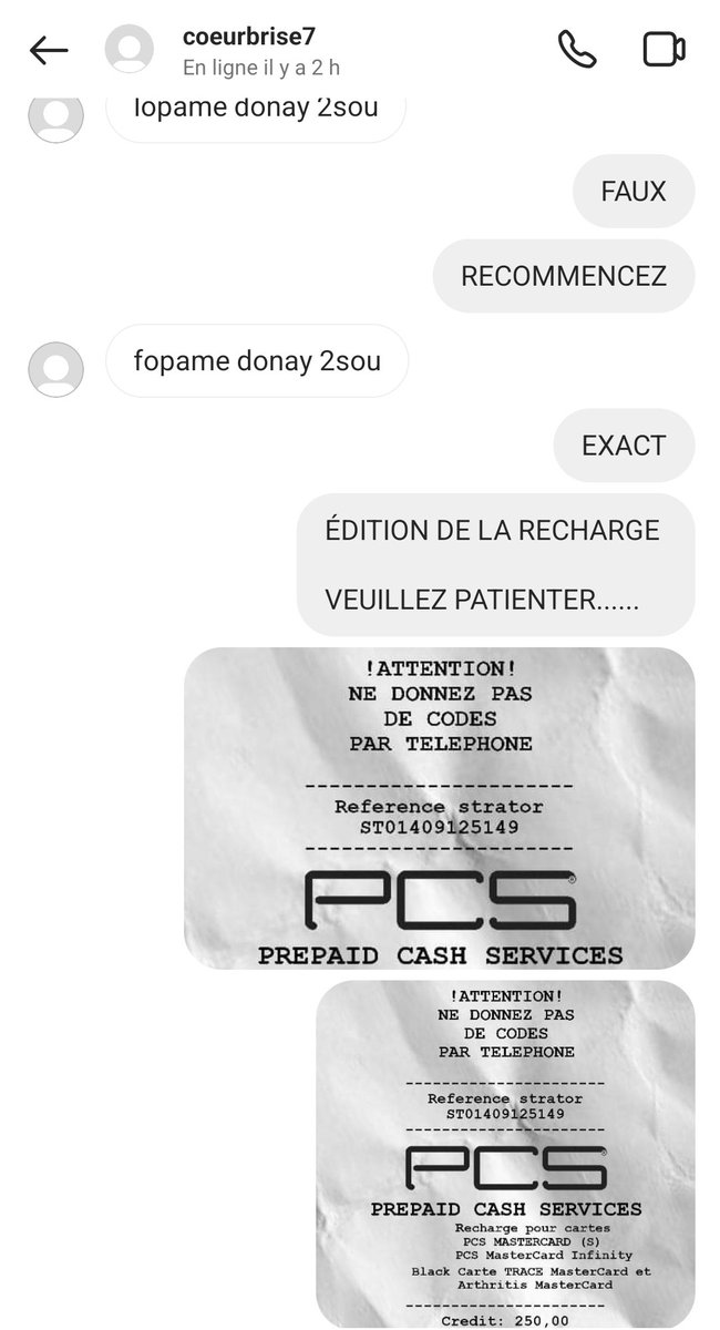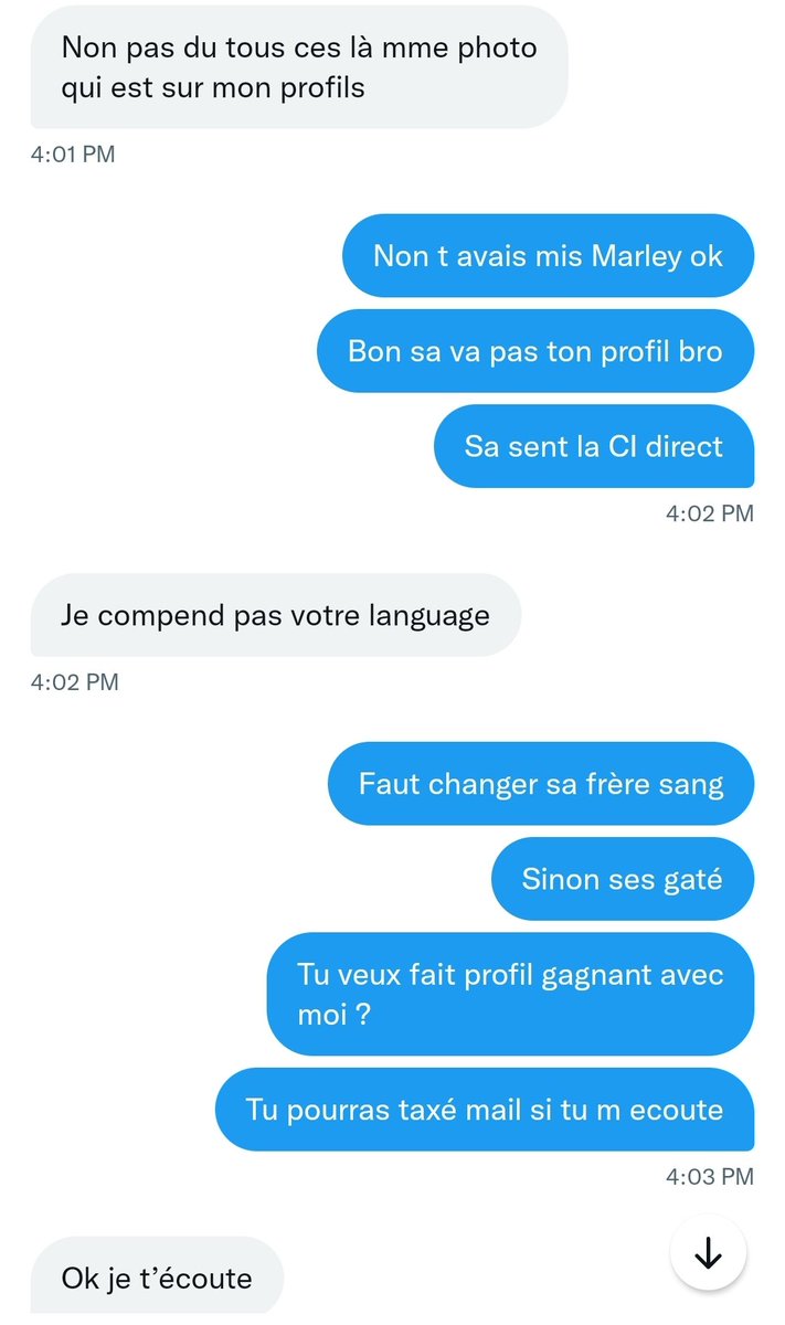 Je lui fais croire que je suis un escroc comme lui. Je lui dis que son process n est pas bon. Que son faux profil sent trop la Côte d'Ivoire (pays dont est originaire l escroc).