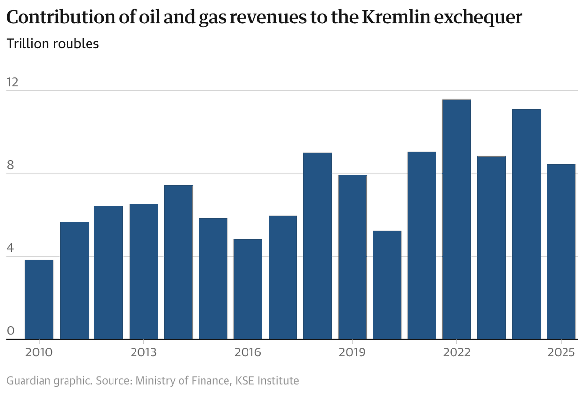 KSE Institute: Russia’s oil and gas revenues fell 24% in 2025, down to 22% of state income from 41% in 2022.