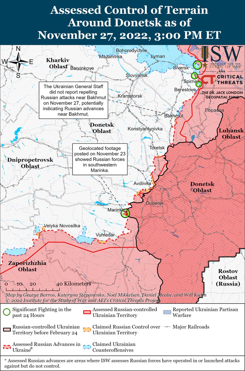 #Russian forces continued offensive operations around #Avdiivka. The #Ukrainian General Staff did not report that Ukrainian forces repelled any ground attacks around Bakhmut on November 27, suggesting that Russian forces may have advanced in the area.