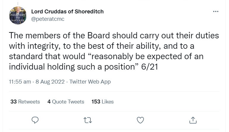 How does the Board fare on carrying out their duties "with integrity"? Well, there was an Electoral Commission report last year regarding funding of the Downing Street flat, which wasn't challenged by the party, so that might give an idea. 3/