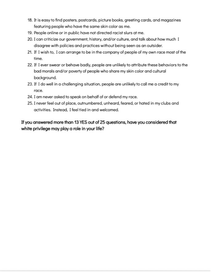 Statements of white privilege include, “I can go shopping alone and be sure that I won’t be followed or harassed,” and “In the history I have studied, my ancestors are given a lot of attention and credit,”among others.