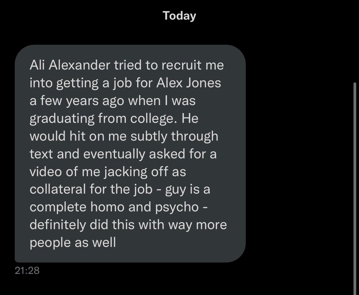 The story keeps growing. A victim of @ali's came forward to GNN and wishes to remain anonymous. He says Ali asked him for a video of him jacking off as COLLATERAL for securing a job with Alex Jones.