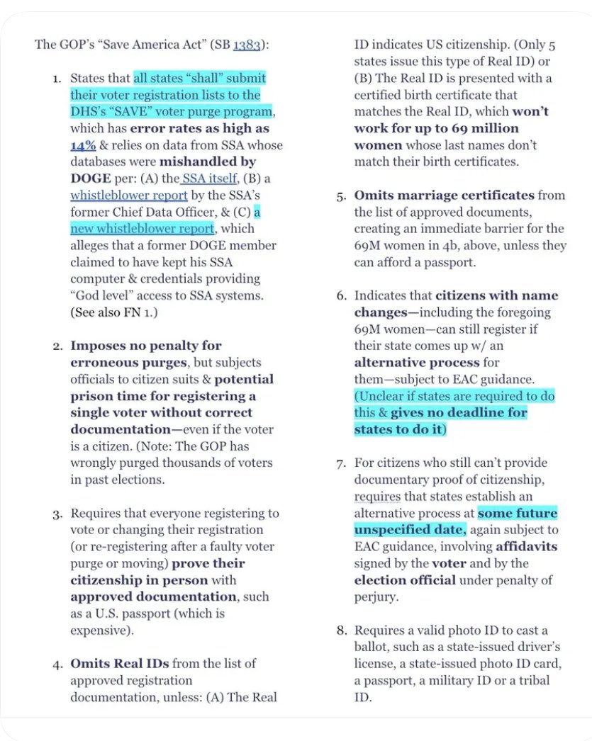 I read the “Save America Act,” so you don’t have to. Most of the media apparently *hasn’t* read it because, if they had, they would be sounding the alarm about the provision in Point 1, below, which almost none of them have even mentioned. I hope this helps raise awareness. 1/