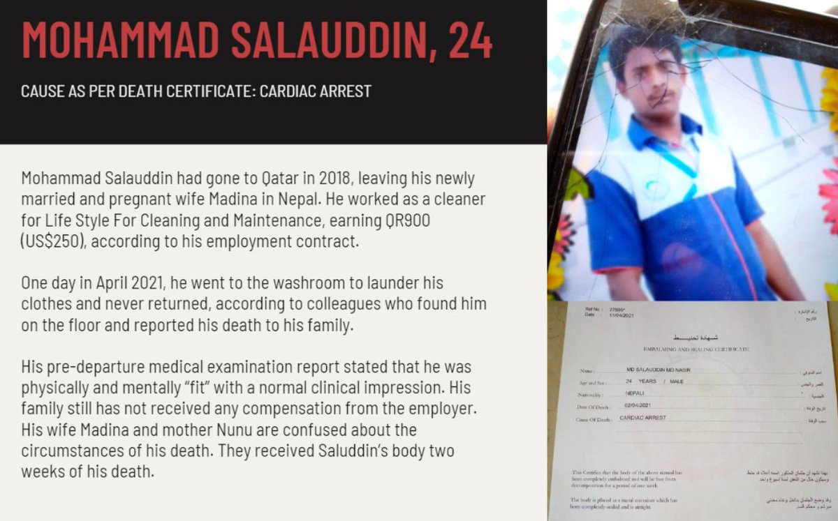 4. His son was a construction worker in Qatar. In Sept, 2021, son's dead body was discovered in bed, blood spilling from his nose and mouth. “He was the only thread of hope,” dad said. “How can we run our family now? We are ruined.”