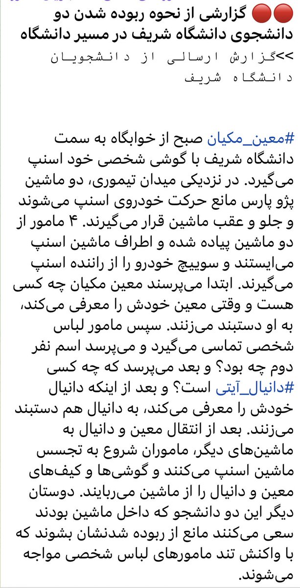 🔴گزارشی از نحوه ربوده شدن دو دانشجوی دانشگاه شریف در مسیر دانشگاه