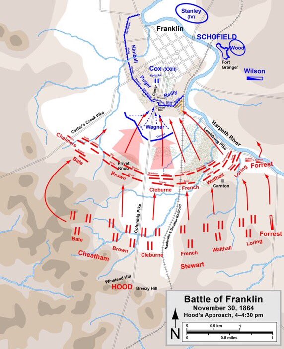 The Battle of Franklin, TN was fought #OTD in 1864, as John Bell Hood continued his offensive into Tennessee, attempting to disrupt General William T. Sherman’s supply lines for his ongoing March to the Sea. #CivilWar 🧵