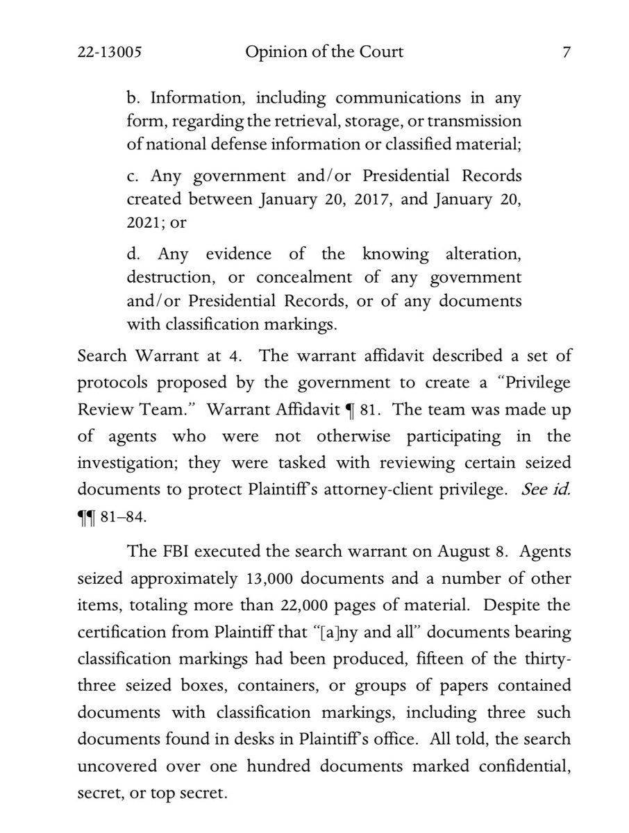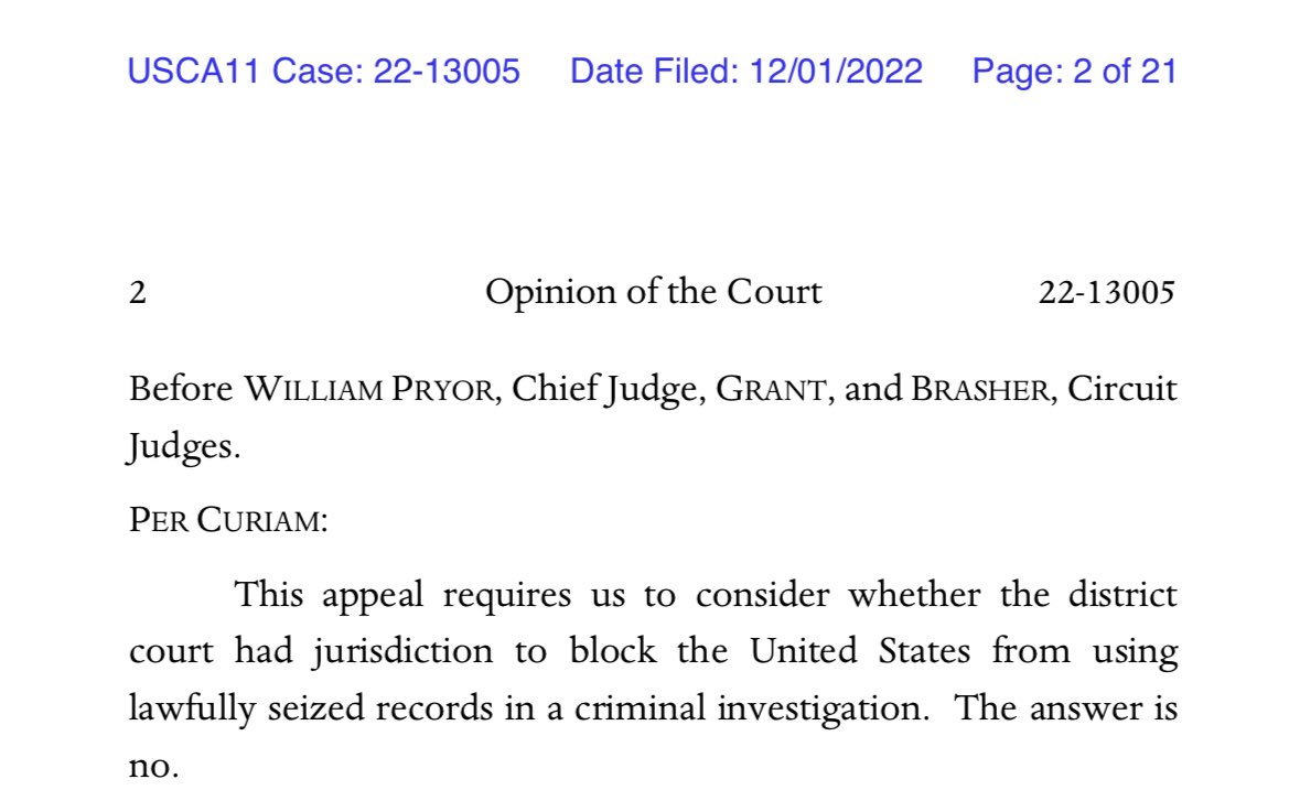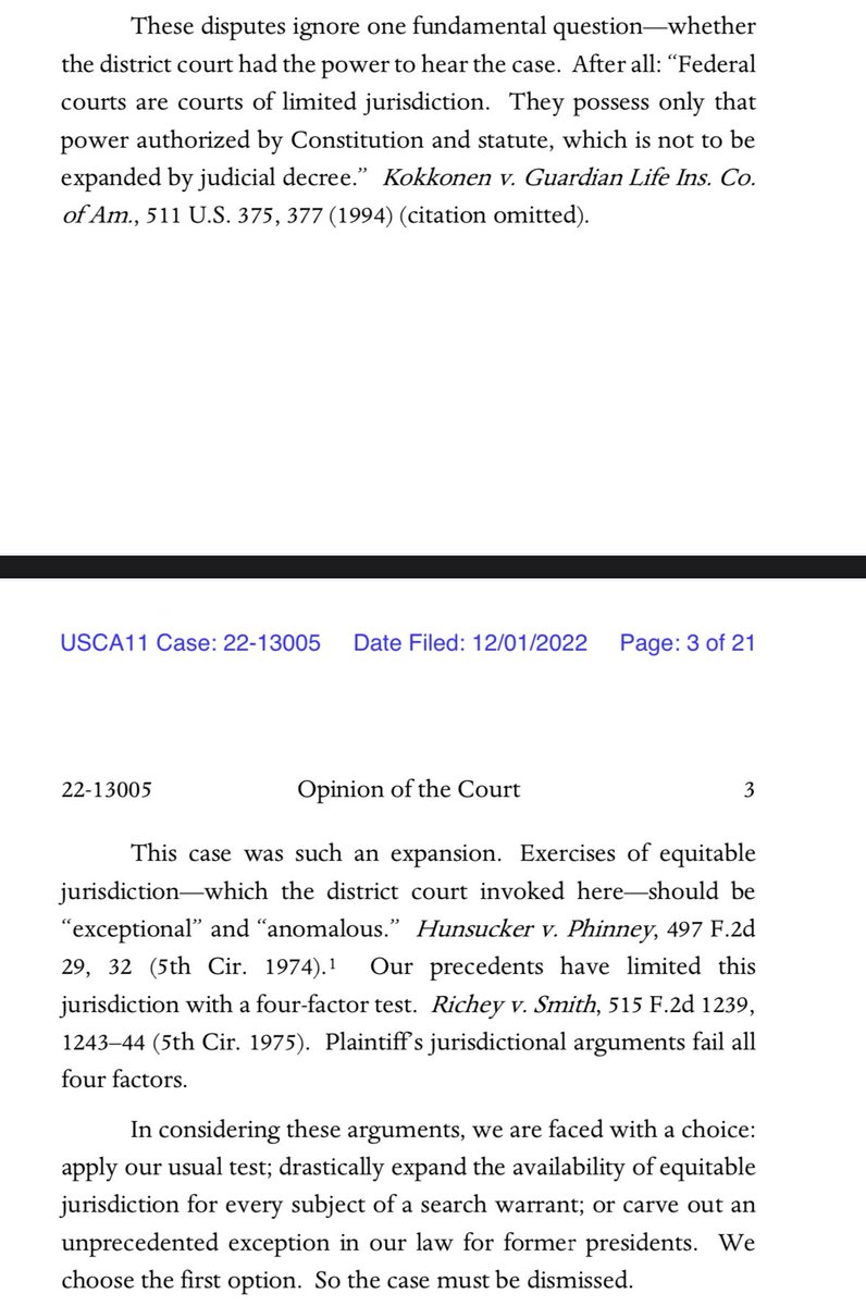 11th Cir: “we are faced with a choice: apply our usual test; drastically expand the availability of equitable jurisdiction for every subject of a search warrant; or carve out an unprecedented exception in our law for former presidents. We choose the first option.” 🤭