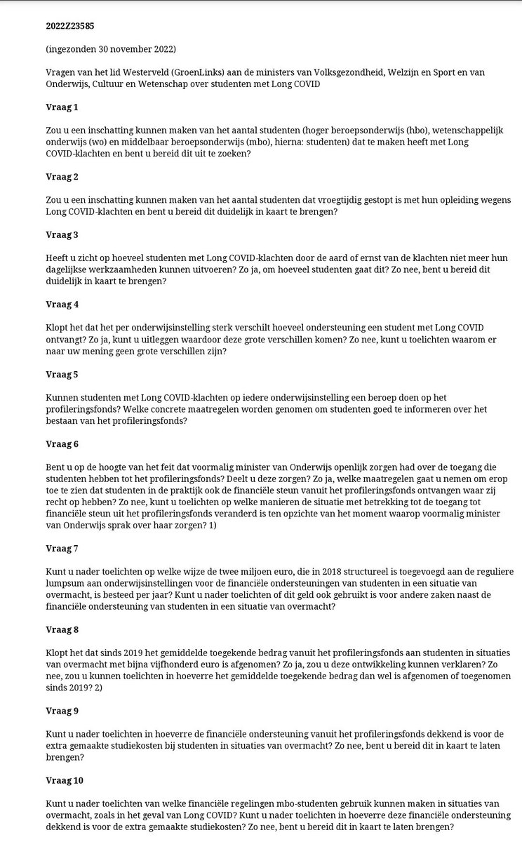 Belangrijke kamervragen van @Lisawesterveld over studenten met #LongCovid, die een goed antwoord verdienen. Helaas kunnen we al uittekenen wat de antwoorden worden: