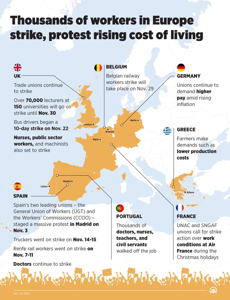 2. There are huge protests and strikes all over Europe -- in UK, France, Germany etc. Many protests are also directly against NATO's involvement in Ukraine war.
