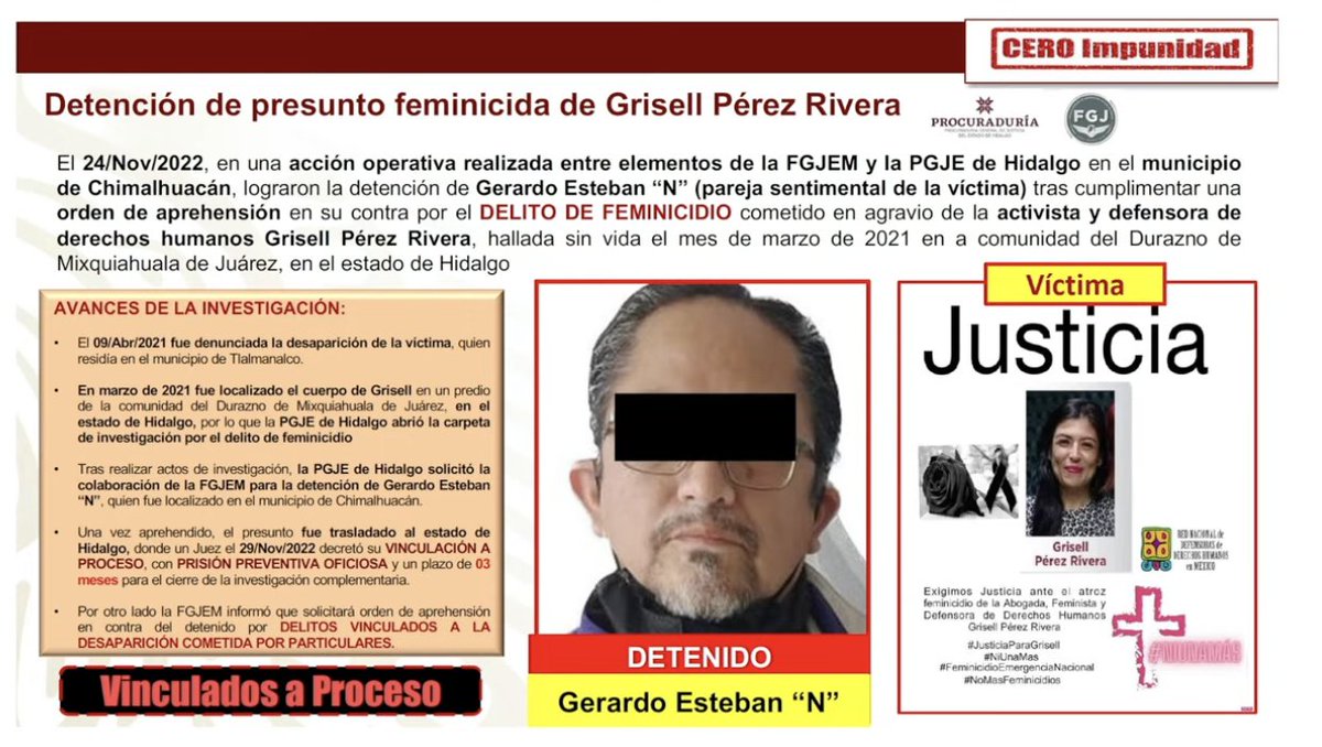 El 24 de noviembre, la Fiscalía del #EdoMex detuvo en Chimalhuacán, a Gerardo Esteban "N", por el feminicidio de la activista y defensora de derechos humanos Grisel Pérez Rivera.