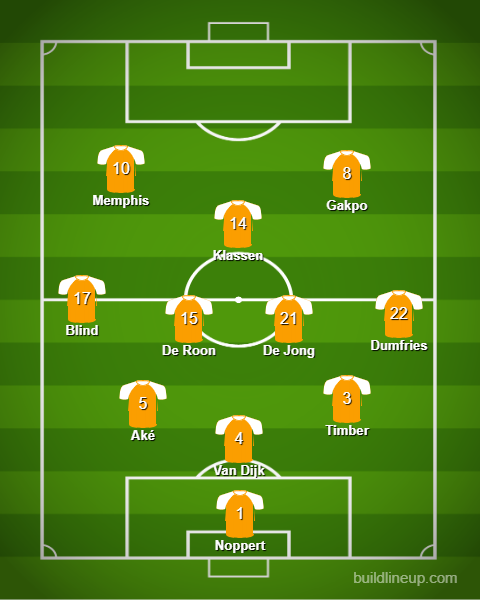 2) Van Gaal suele implementar una línea de 3/5 defensores para darle libertad a sus carrileros (más Dumfries). El equipo ha variado durante el mundial, principalmente el compañero de De Jong en el doble 5. Jugaron Berghuis, Koopmeiners y De Roon.