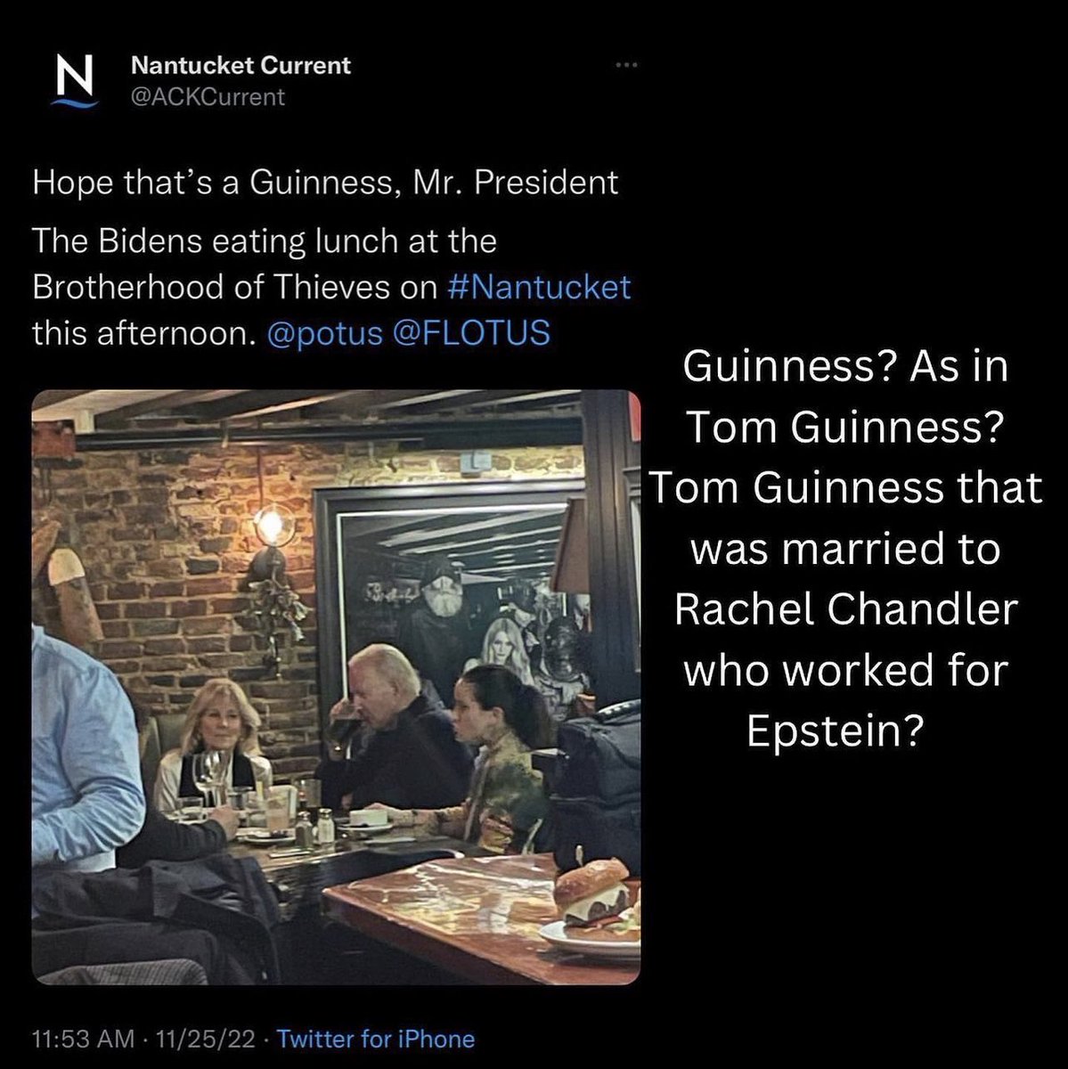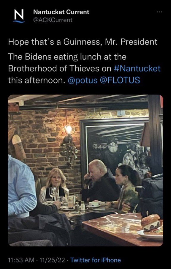 2/10 I’ll touch back on the restaurant at the end, but apparently Nantucket has been a Biden thanksgiving tradition since 1975 and this was his 2nd year in a row staying at Rubenstein’s home. His home is only a few miles away from the Nantucket airport.