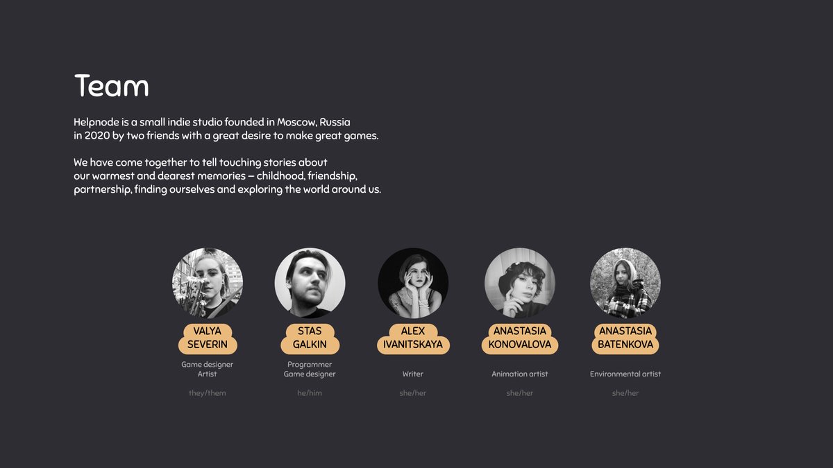 в какой-то из версий питча у нас еще около каждого разработчика было подписано, почему он классный. сюда можно написать ваш опыт, выпущенные игры (если есть), предыдущие работы