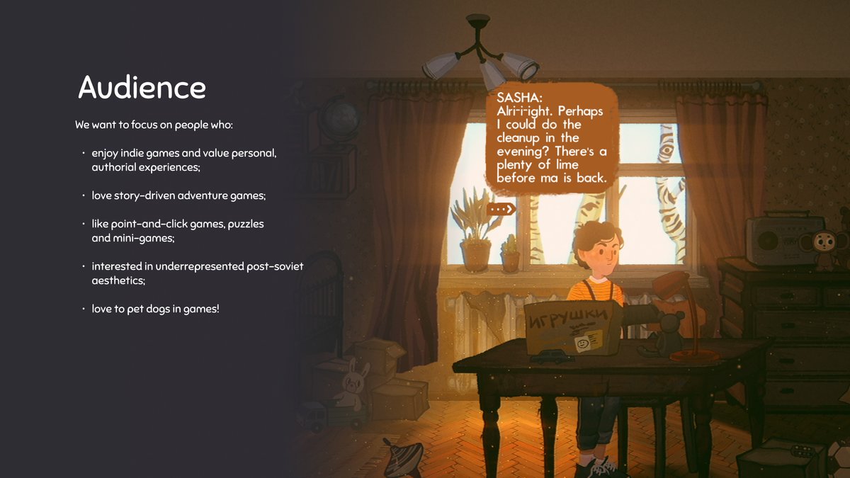 мой вывод из полученного опыта: делать более интерактивные и геймплейно насыщенные штуки. это интереснее и мне, как гд, и игроку (а "легкость" адвенчур на мой взгляд сомнительна — если бы это было так, нам бы не пришлось два года фуллтайм пилить игру и ВСЕ ЕЩЕ не допилить)