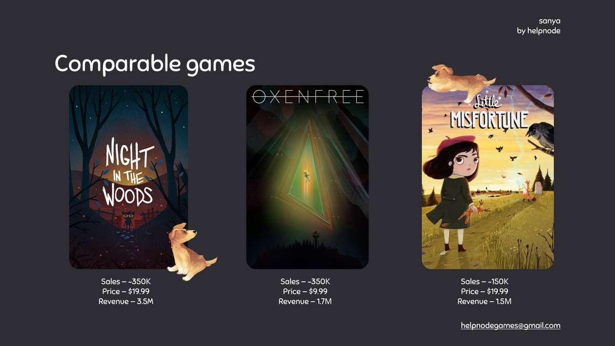9) очень полезно будет сделать слайд с похожими играми. проведите небольшой ресерч: сколько копий было продано, по какому прайсу, сколько игра заработала?
