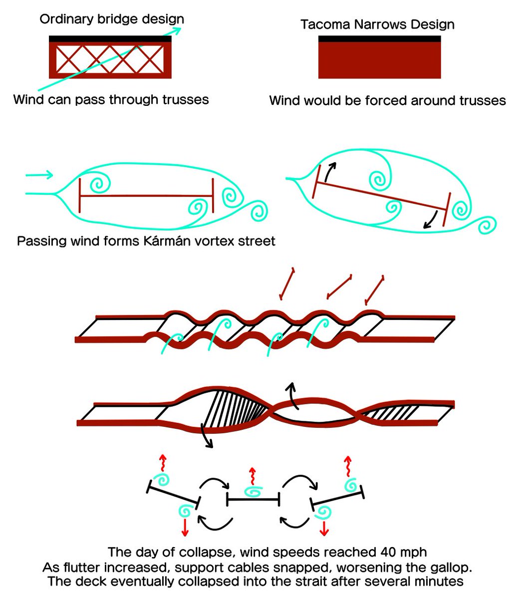En condiciones de menor viento, ese movimiento de torsión debería haberse ido parando hasta llegar al equilibrio, pero justo esa mañana soplaba un viento sostenido de 64 km/h que "empujaba" constantemente el tablero EN LA MISMA FRECUENCIA de la oscilación.