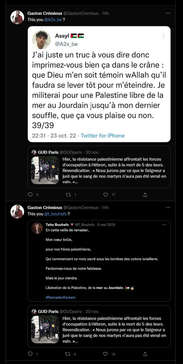 Nous avons donc un compte, @GastonCremieux, qui prend donc pour pseudo cette identité particulière d'un héro républicain et juif, et qui, sous ce pseudo, vient jouer le GUD contre les Indigènes antisioniste en taguant l'un contre l'autre
