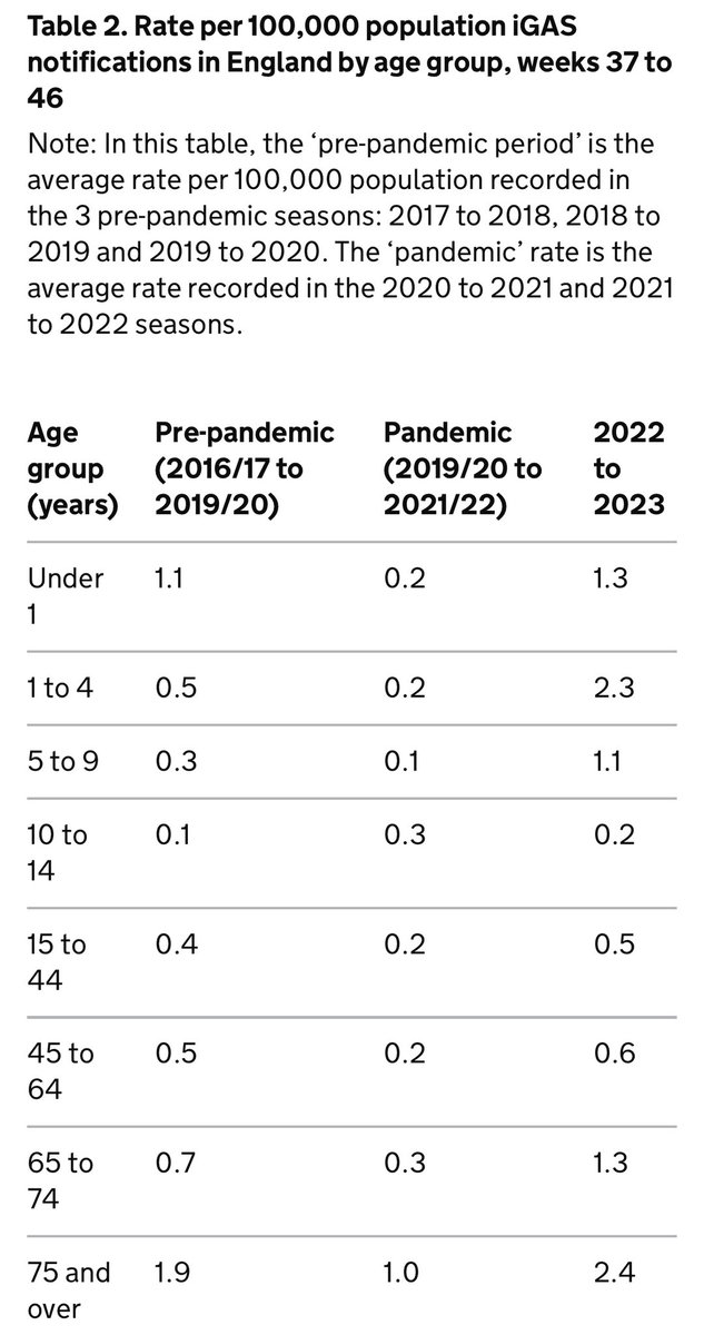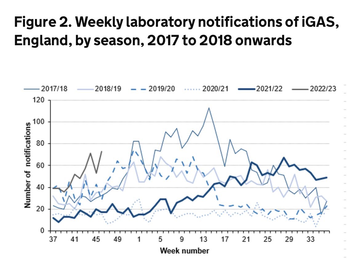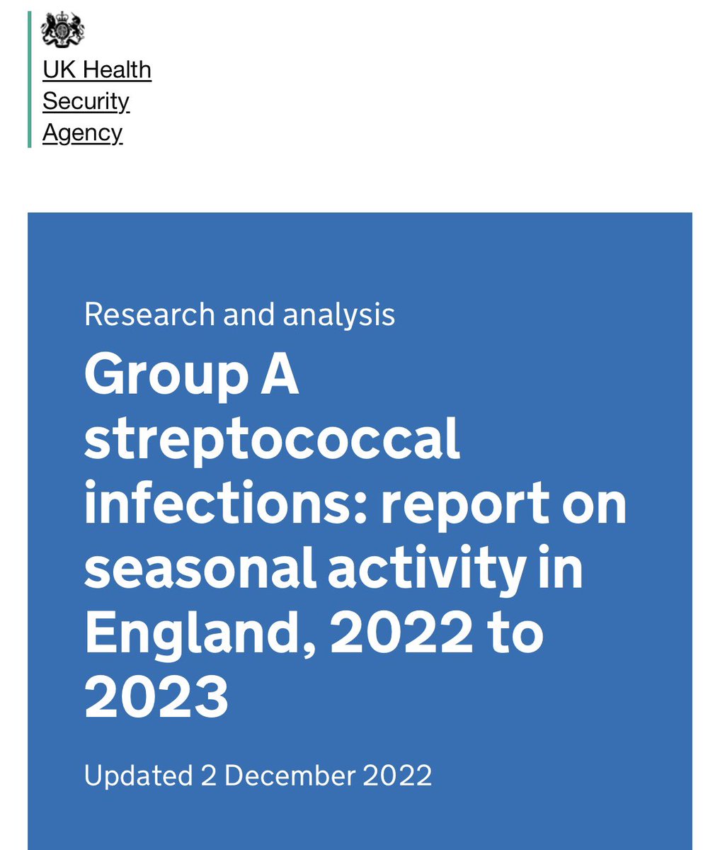 „Insgesamt wurden in dieser Saison bislang 5 Todesfälle innerhalb von 7 Tagen nach der Diagnose einer iGAS (= Invasive Streptokokken-Infektion der Gruppe A) Infektion bei Kindern unter 10 Jahren verzeichnet. Zum Vergleich: In der Saison 2017-2018 (vor der Pandemie), waren es im
