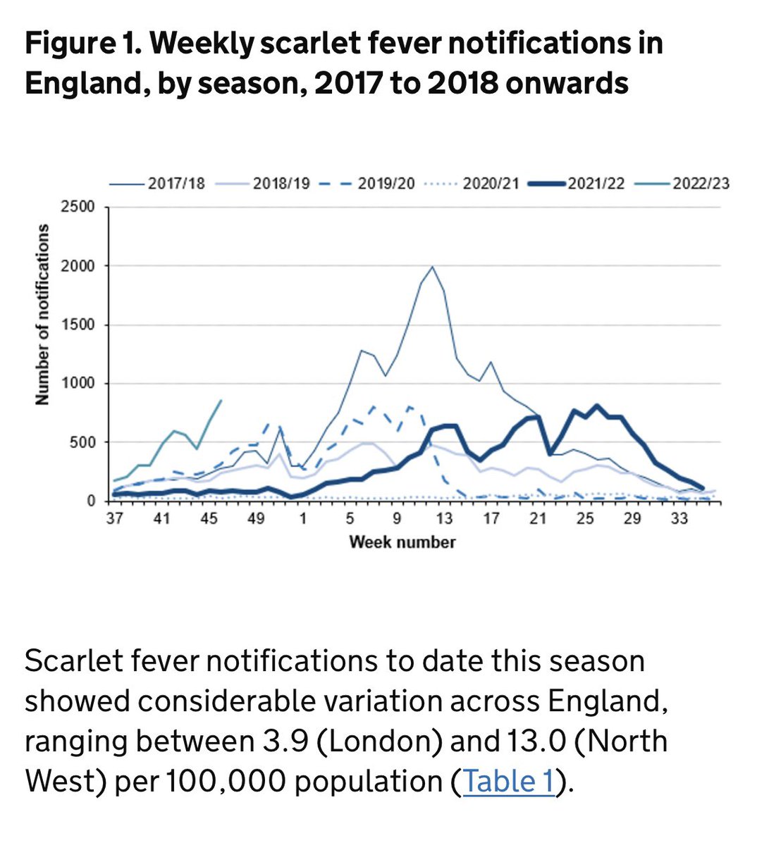 Zu Beginn der Saison 2022-2023 gab es einen steilen Anstieg der Scharlachmeldungen und hausärztlichen Konsultationen, der steiler ist, als zu dieser Jahreszeit zu erwarten wäre. Die Rate der Meldungen von iGAS-Infektionen folgt einem ähnlichen,