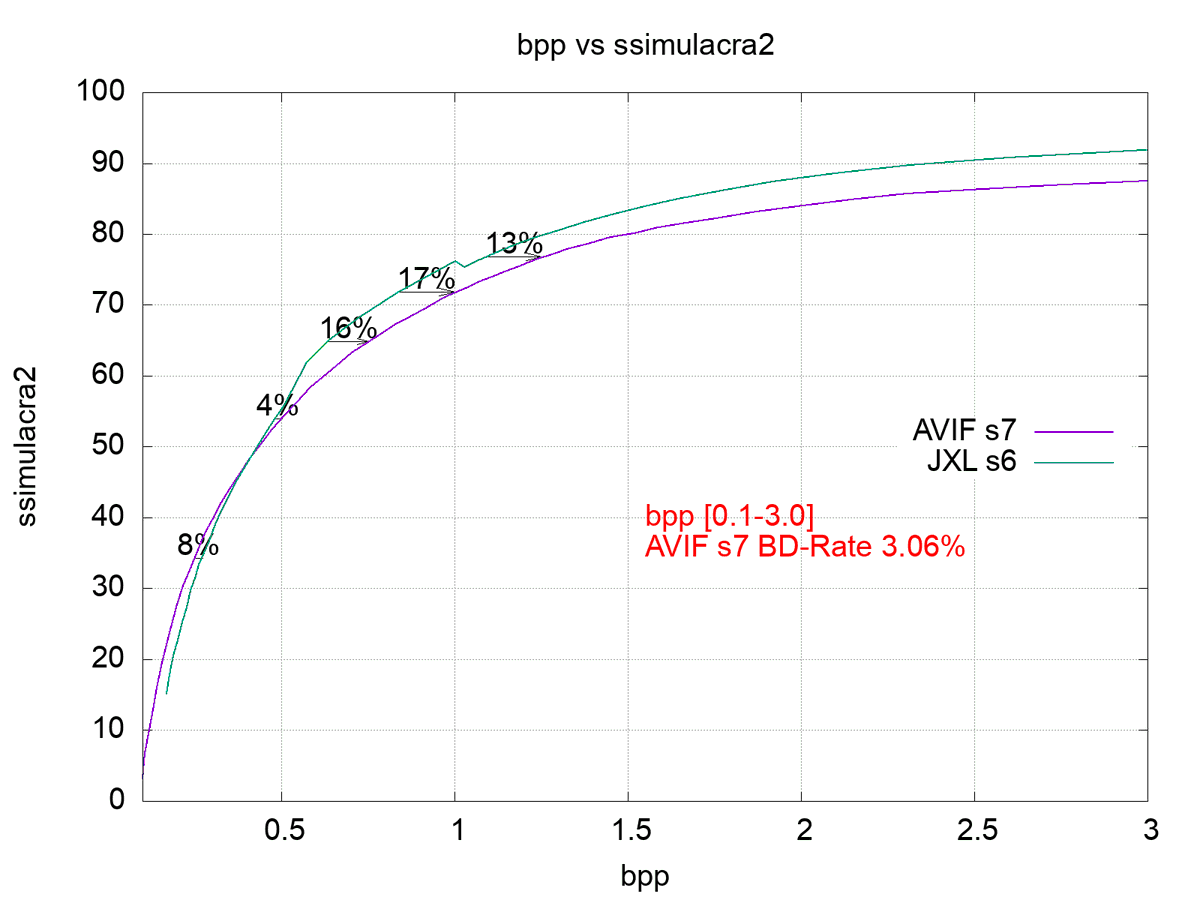 For example, on this plot you see that their data confirms and even exceeds my estimate that JXL compresses 10-15% better than AVIF in the range that is relevant for the web. However by putting a lot of weight on the < 0.4 bpp range, this plot is averaged to "JXL is 3% better".