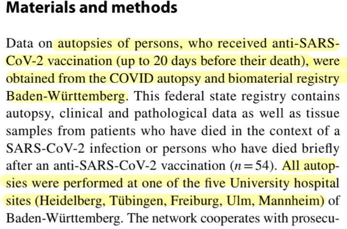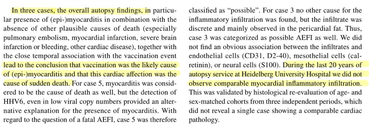 6/n Nun zur Heidelberger Studie, in der 25 Personen die unerwartet kurz nach der Impfung (innerhalb von 20 Tagen) gestorben sind eine Autopsie erhielten. Bei 4 dieser Patienten fand man eine (Peri-)Myokarditis ohne plausible andere Todesursache.