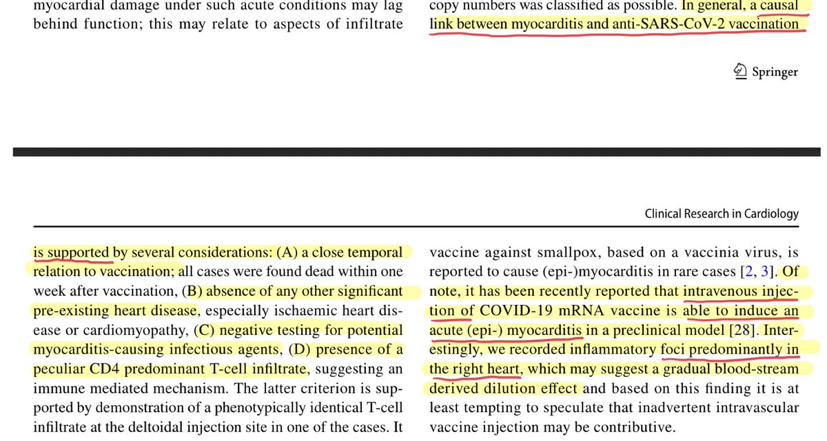9/n Die Autoren gehen von einer kausalen Beziehung (Impfung ursächlich für plötzl. Herztod der zuvor Herzgesunden) aus. Und merken an, dass ein möglicher Mechanismus die intravenöse Applikation der Impfung sein könnte (Anmerkung: meist wurde in den Impfzentren NICHT aspiriert!).