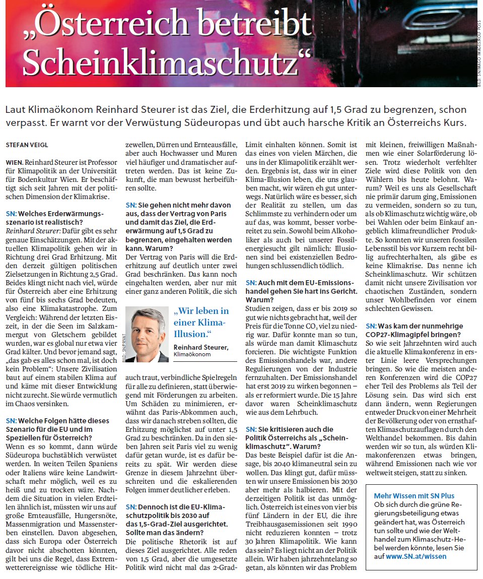 COPs werden erst liefern, "wenn Regierungen entweder Druck von einer Mehrheit der Bevölkerung oder von ernsthaften Klimaschutzauflagen durch den Welthandel bekommen". Bis dahin werden wir so tun, als ob Klimaschutz wichtig sei. Interview Salzburger Nachrichten, 9.11.22, S20: