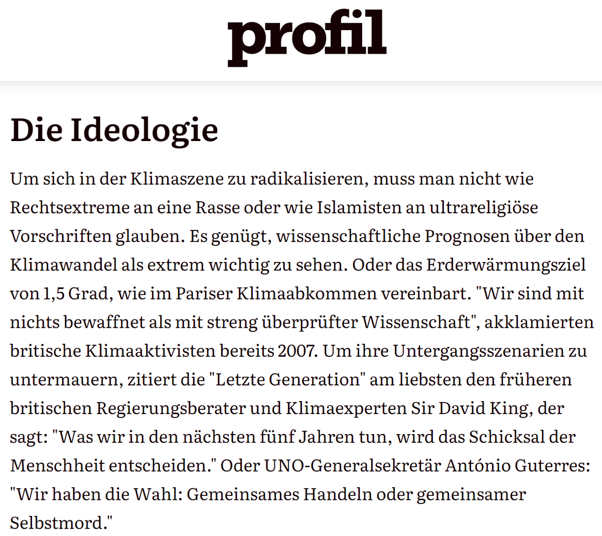 Ganz anders @profilonline über @letztegenAT. Da steht unter der Überschrift "Die Ideologie": "Es genügt, wissenschaftliche Prognosen über den Klimawandel als extrem wichtig zu sehen". Lieber @neuholder, das ist für sie "Ideologie"?
