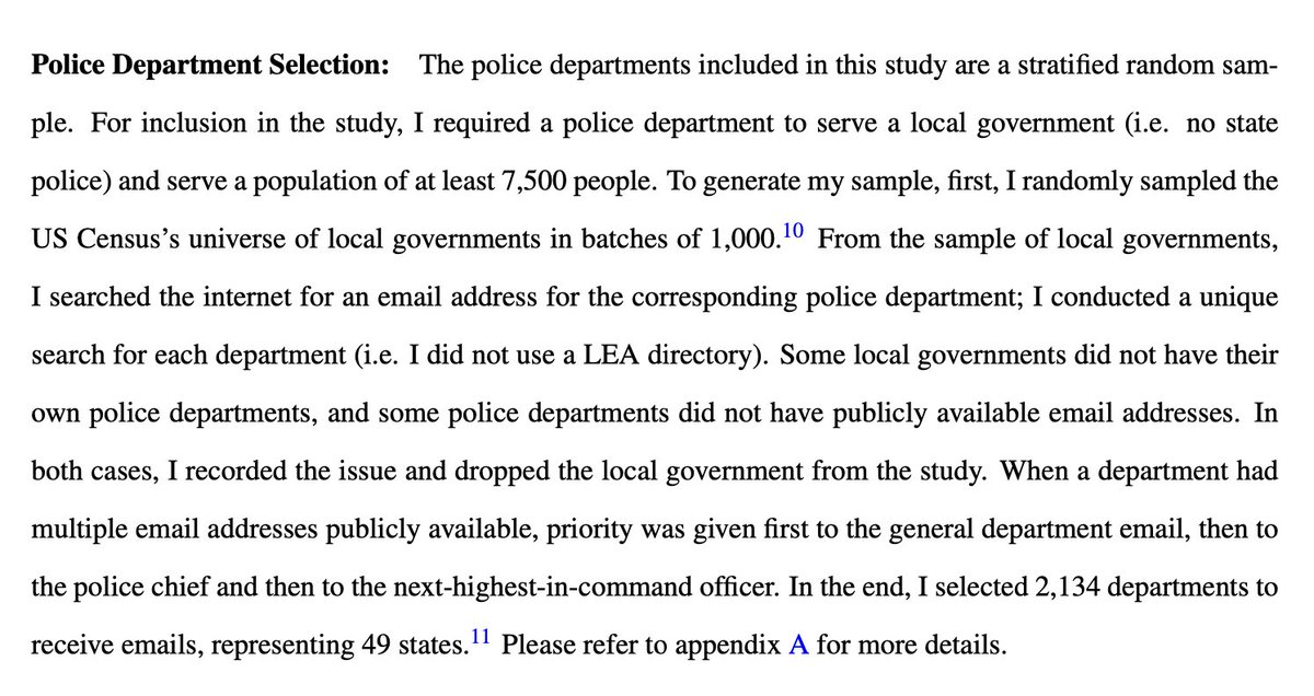 An economist did an experiment by emailing ~2000 police agencies asking for help filing a complaint. He randomized the “sender’s” name to signal race/ethnicity and sex. Overall RR 67%; agencies less likely to respond to emails signed w/Black or Hispanic names. #AcademicTwitter