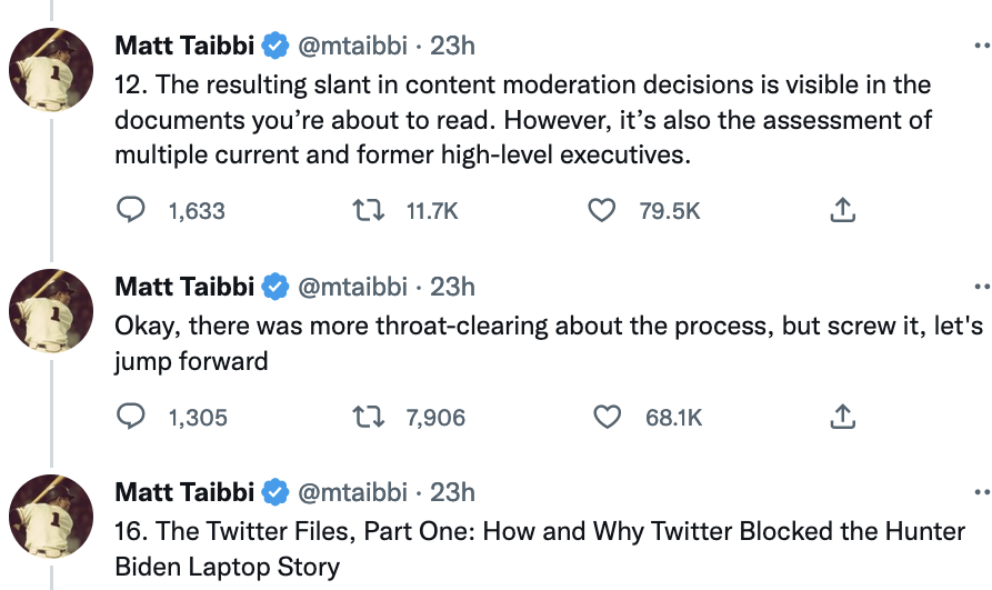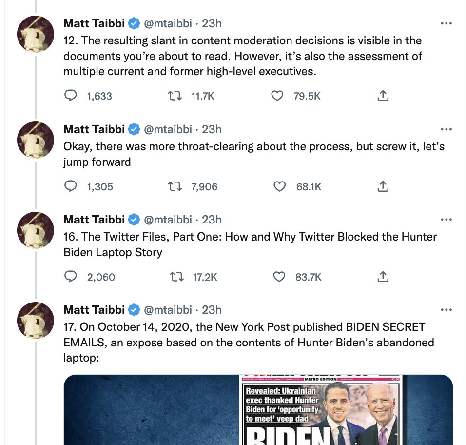 ... when he skips over part of the thread, he talks like it's not even his own: "There was more throat-clearing.." Taibbi's clearly working from a draft, but when he posted he took minutes between Tweets. It's like he was delivering someone's script, tweaking it as he went. 3/