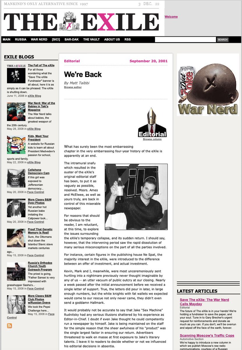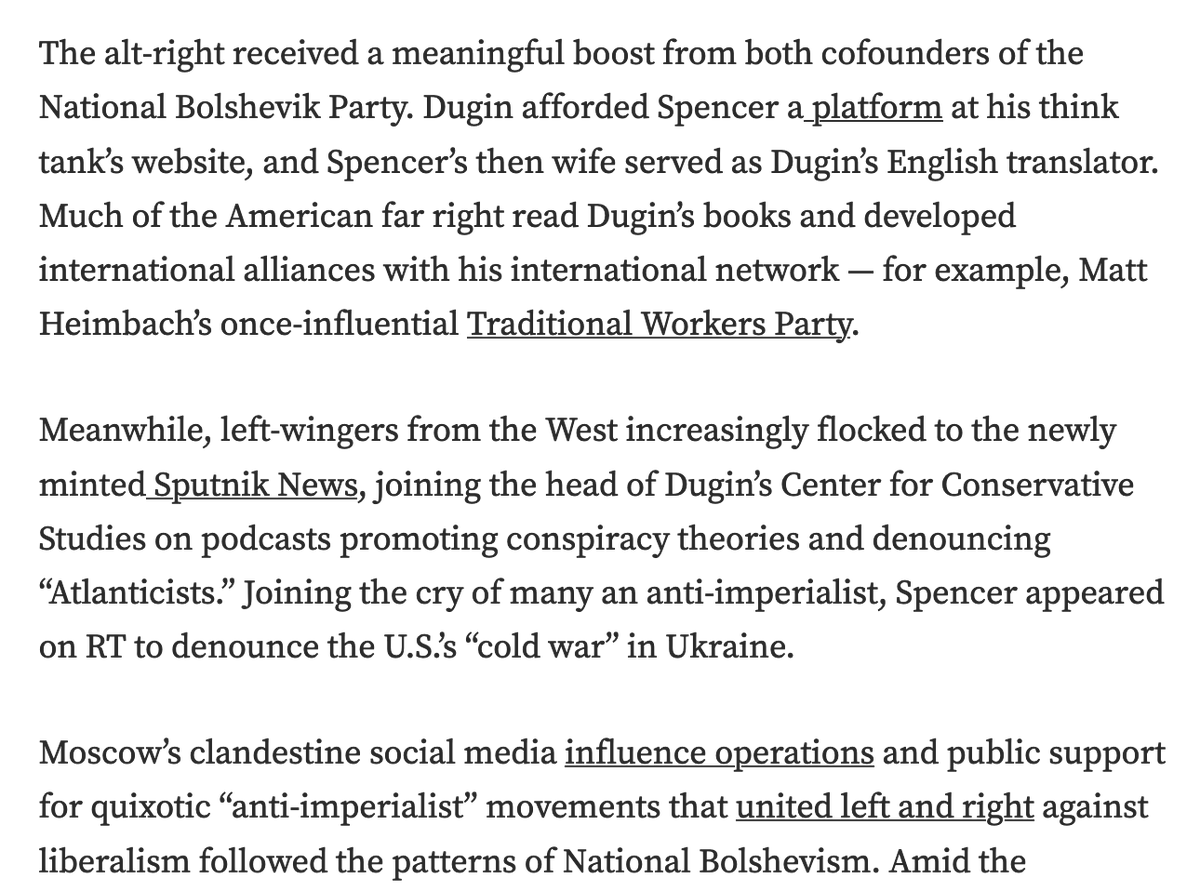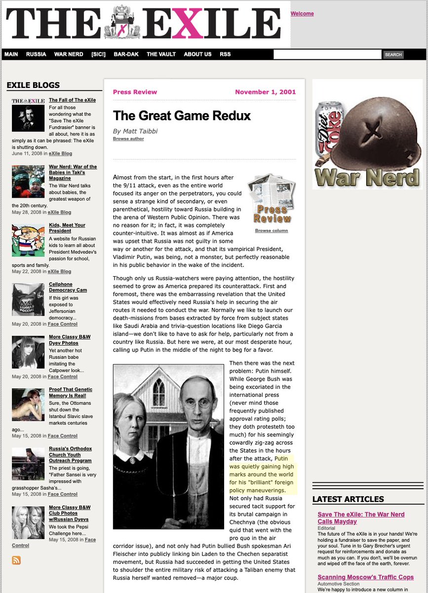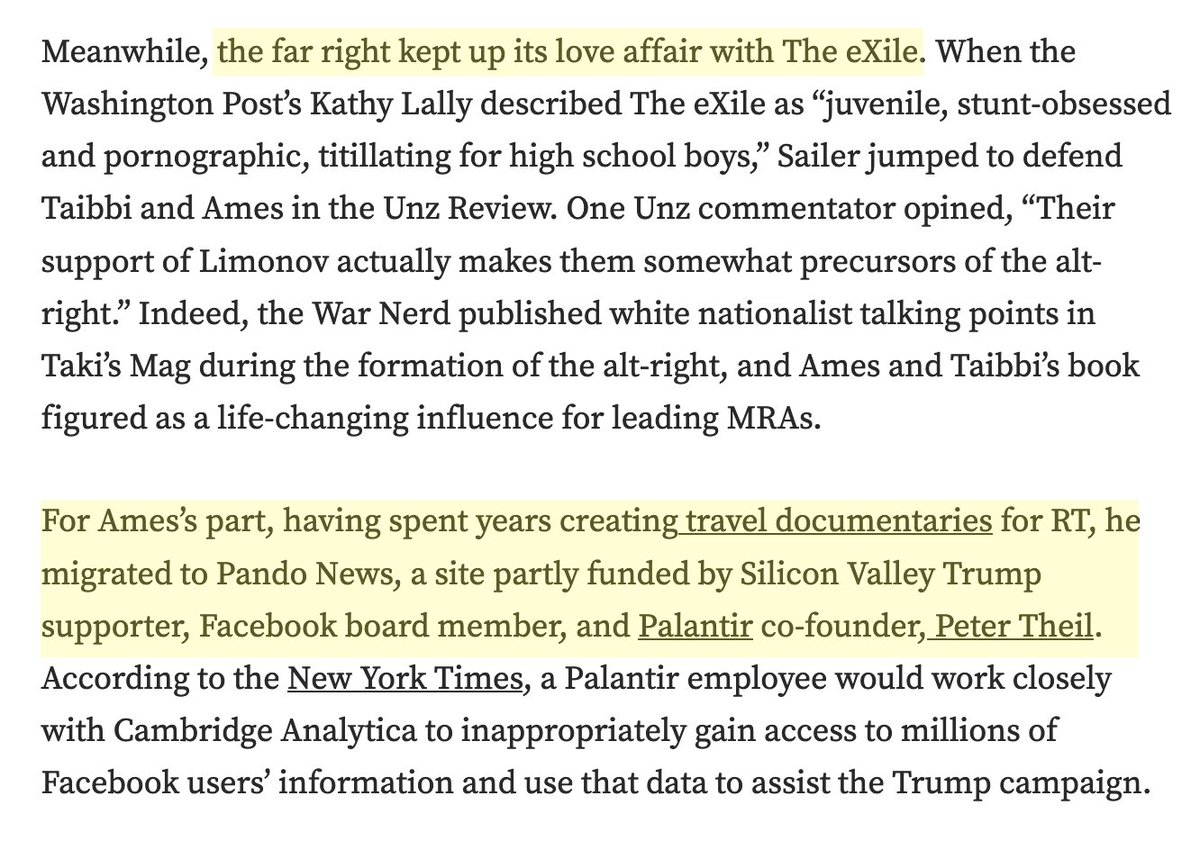 Adding on an article by @areidross on Matt Taibbi's time at eXile, its ties to Richard Spencer and the alt-right, the rape culture and boorishness, and most insightfully, the way that the magazine supported Putin's ends despite a veneer of criticism..11/ medium.com/@areidross/fro…