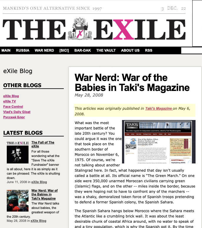 Taibbi left Russia in 2002, leaving the The Exile to his partner Mark Ames, who wrote about the joys of sex with a 15-year-old. By 2008, Ames was sharing articles with Taki's Magazine, led by the young neo-Nazi Richard Spencer, who had recruited Gavin McInnes as a columnist...7/