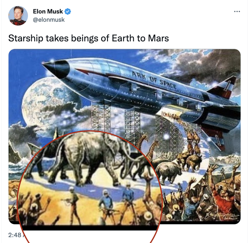 Elon Musk just Tweeted this out as his positive vision of the future (magnification added). Did we mention yet that he grew up in apartheid South Africa?