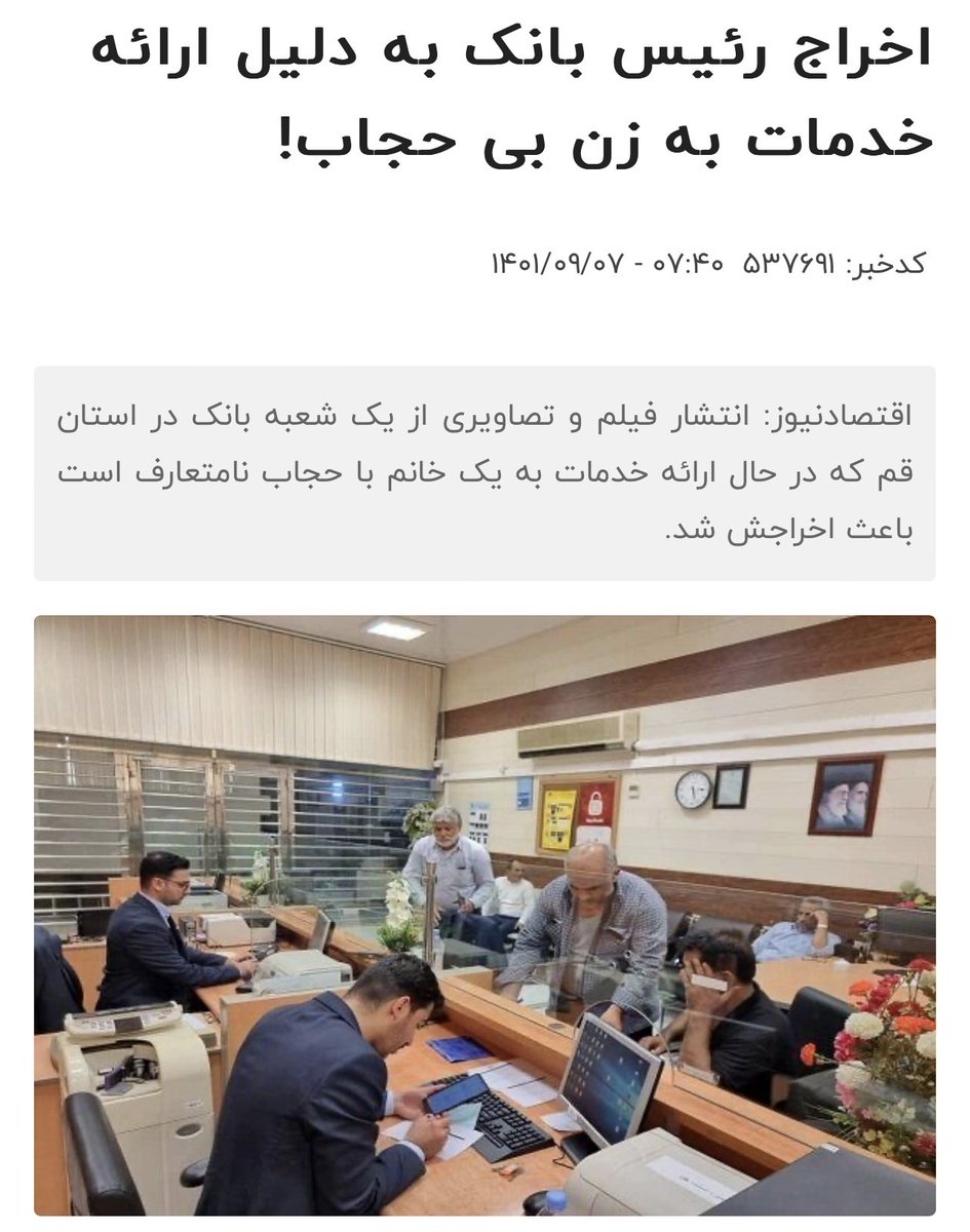 مدیر یک بانک در قم اخراج میشه، دلیل؟ ارائه خدمات به خانم بیحجاب!