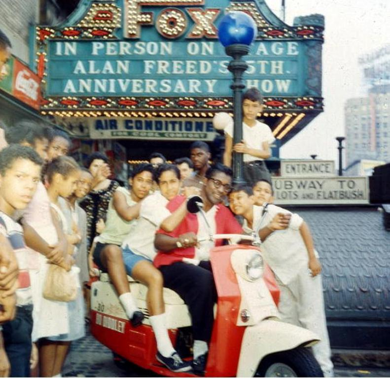 Another shot of Bo and the Cushman from the album cover session at 368 Livingstone Street Brooklyn NY, plus a candid shot showing girls can't resist a man on a scooter. Album release was January 1960, so I estimate date sometime 1959.