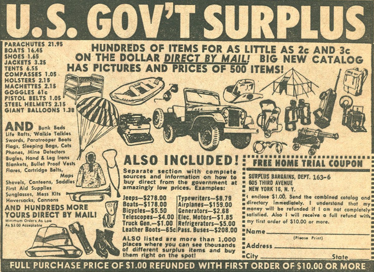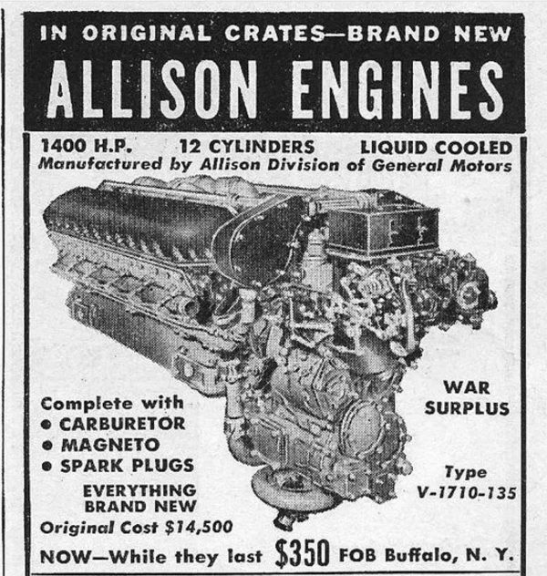 Always fun to read the old WW2 war surplus ads where you could buy Jeeps and Cushman scooters and life rafts and whatnot for pennies on the dollar. Allison V12 aircraft engines for $350! A lot of them ended up in 50s-60s drag race and land speed cars.