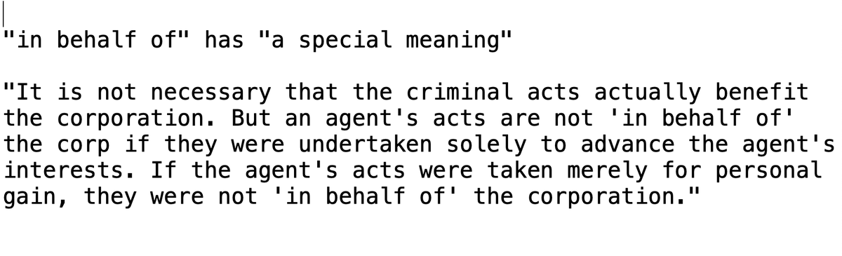 Judge: "It is not necessary that the criminal act to actually benefit the corp. But the agent's acts are not 'in behalf of' if they were taken solely to advance the agent's interest. If the agents acts were merely taken for personal gain, they were not 'in behalf of' the corp."